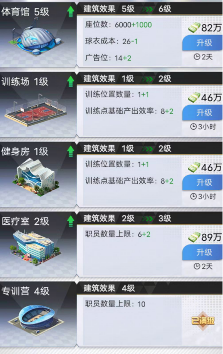 现阶段版本优先升级顺序为:专训营>体育馆>医疗室=健身房=训练场。专训营等级关乎可雇佣专训员数量,最大为4级(球队21级)解锁10个专训员。提升体育馆可增加广告位和座位数,带来绿钞收益。