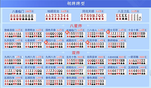 3、飘胡:手中全是叉牌,最后对对胡或单贴胡;