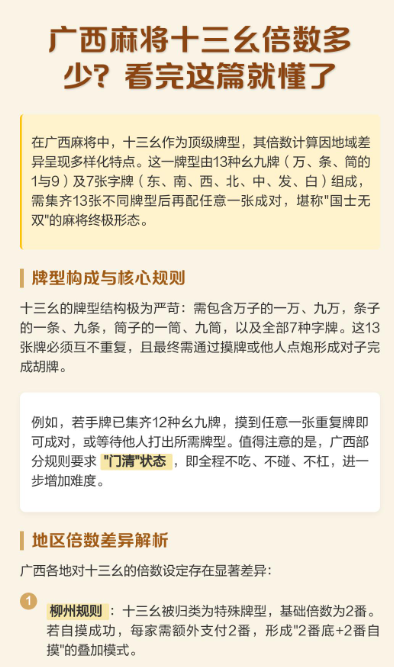 1.柳州规则:十三幺基础倍数为2番,自摸时每家额外支付2番,形成“2番底+2番自摸”叠加模式。若叠加其他牌型(如碰碰胡),总分值可能突破常规上限,曾有玩家单局收益超常规3倍。