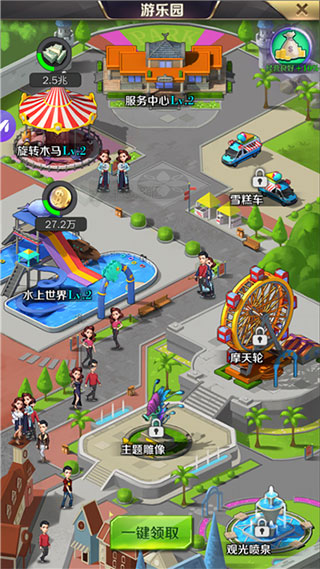 水上世界(金币,铝合金,改装件) 摩天轮(购物卡,培训点) 主题雕像(提高接待能力)