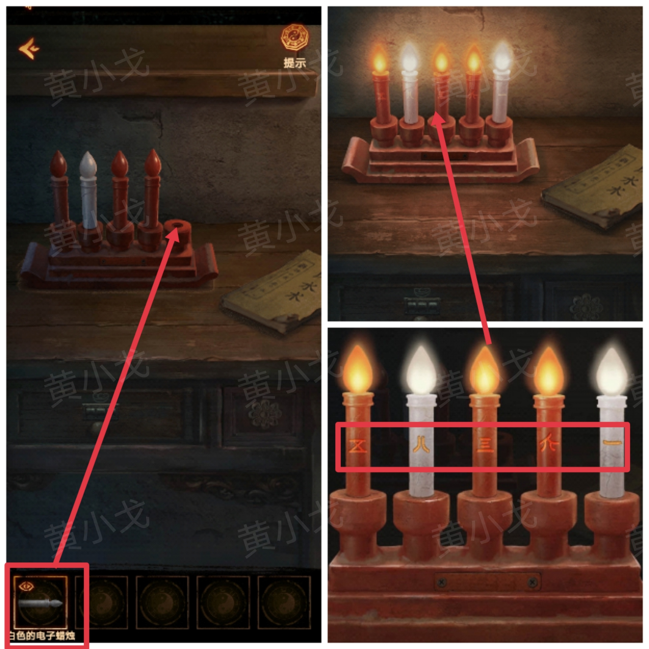 7.把【白色的电子蜡烛】插入电子烛台,蜡烛亮起,查看上面的符号