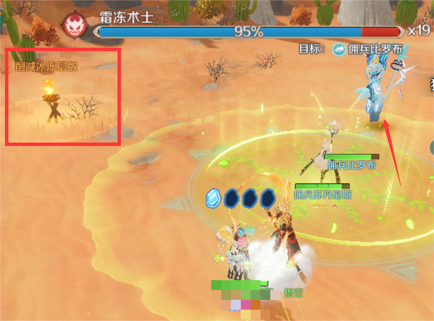 玩家被BOSS技能击中会造成伤害,同时会积累冰霜印记,达到4次会进入冰冻状态,通过地图上的三个火把可以减少冰冻的层数;