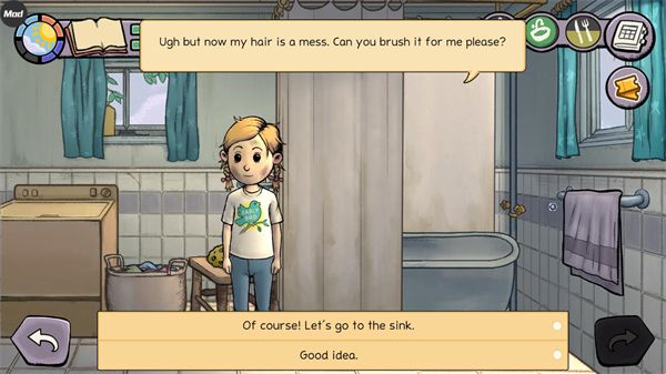 5、通过左下角和右下角的切换按钮,可以进入不同的生活场景,如卧室、厨房、客厅等,每个场景都有不同的互动选项与养育功能。