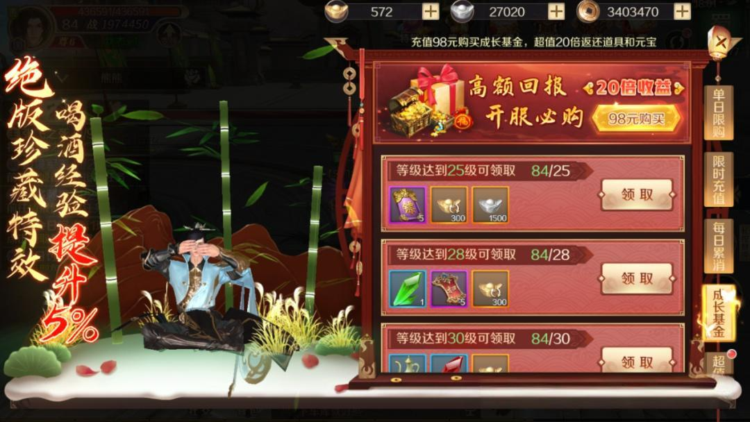 1.在首日主要是通过主线和押镖刺探和日常活动玩法等达到首日的等级目标。