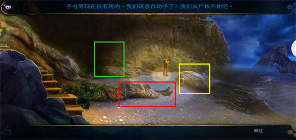 7、回到悬崖,对阴影处使用手电筒。先对红框处点击放大后,先对尸体使用照相机留下证据。之后点击尸体头部的布移开后,对尸体脸部使用照相机留下证据。最后点击尸体手上的手表得到证据,之后点击尸体身上的衣服掀开,找到钱包,得到里面的密码图案。之后点击黄框处的小船放大,点击移开救生圈后,对小船左侧有绳子的地方使用充气浮标,之后使用打气筒(抽气泵),多次点击小船后得到马克的钱包,里面有一张纸条进行阅读后得到线索,最后点击钱包左侧,得到卡片。再在绿框处点击放大后使用剪枝钳,得到里面的第二个金字塔碎片