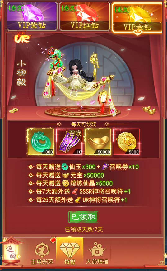 紫钻(6)、红钻(30),增加每日试炼副本次数,boss挑战次数,妖界幸运次数,长完玩家必备,开启妖界三倍挑战,大大缩短日常任务所需时间。