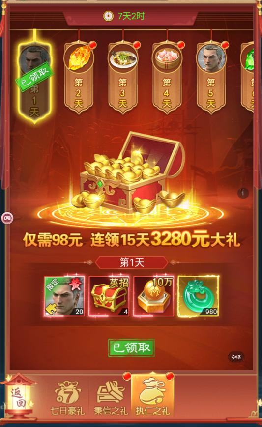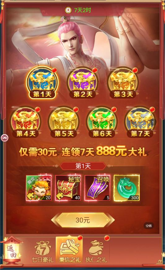 执仁之力(98元),能连续领15天内容,直接解锁联动神将“唐三藏”,特殊神将特性,品质可进阶,还有大量神将通用升星石,快速升星神将解锁神将技能。