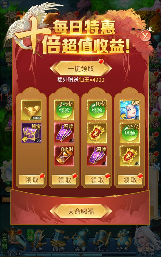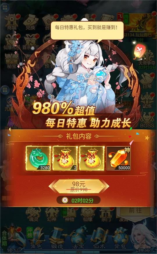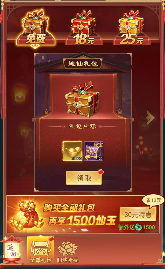 与至尊礼包相同,主要是能获得大量经验,各礼包每天可购买一次,建议98元购买所有礼包10天,额外送4900仙玉,每天能领37.5亿经验,3个祈福令牌,11张召唤券,祈福令牌可拿去天命祈福抽神将,同时提升战力。