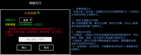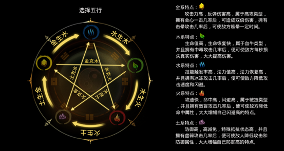 游戏中有金木水火土五种五行可供选择,玩家可根据各系特点选择自己喜欢的五行进入游戏,如果在玩了一段时间后对当前五行不满,可以在50级之前免费转1次五行,后续转五行讲消耗涅槃丹,涅槃丹价格昂贵,请谨慎选择五行。