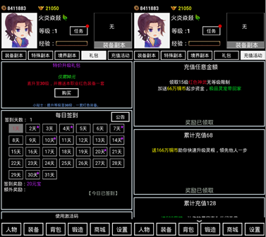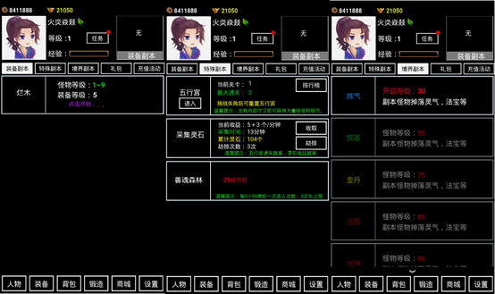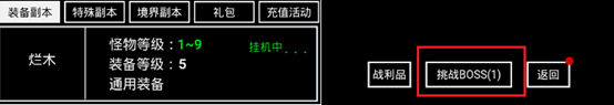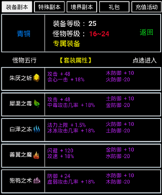 进入游戏,可以看到游戏界面主要由几大模块组成,分别是:装备副本、特殊副本、境界副本: