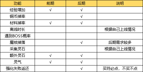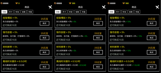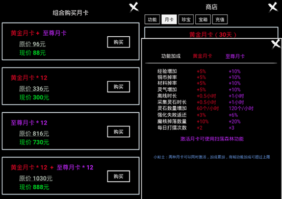 月卡:增加升级效率、材料掉率、副本次数等,组合购买更划算。