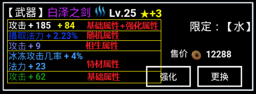 « 强化属性:属性颜色为黄色,该属性由强化等级决定,是提升实力很重要的部分。武器强化攻击、防具强化防御、项链强化生命、戒指强化法力,披风内甲强化各系特有属性,强化数值计算该装备全部攻击、防御、生命或法力。