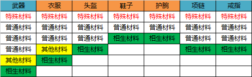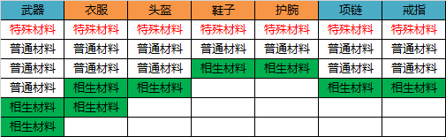 这种情况对于头盔、鞋子、护腕、项链、戒指这五个部位来讲,当特殊材料跟普通材料不属于同类的时候,就会出现无法再继续放相生材料的情况,即变成了方式一,这种情况会降低极品装备产生的概率,需要特别注意。