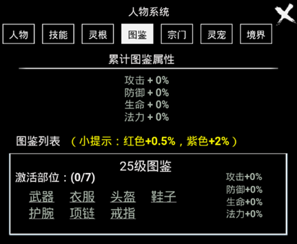 人物面板里面包含人物属性、技能、灵根、图鉴、宗门、宠物、境界共7个部分。