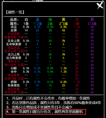 « 随机属性:属性颜色为蓝色,该属性由装备本身等级、五行决定,一件装备随机携带1~4条随机属性类型和属性值,锻造后属性类型随机选择其中一条,属性值在固定范围内随机生成,装备是否极品,主要取决于随机属性,随机属性挑战玩家耐心和财力。