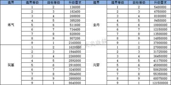 境界副本,顾名思义用来提升境界的,目前境界有练气、筑基、金丹、元婴、化神,5个境界,每个境界需要灵气提升(详细数据请见数据篇-境界),每级提升攻击、生命、血量、法力四维属性1%,每大阶提升3%。