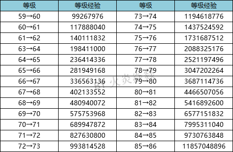 前期升级较快,不再统计,仅列举后期60级-85级相应需求。