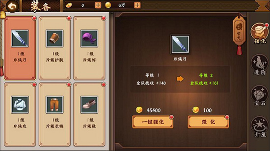 点击“强化”按钮,会强化装备1级;点击“一键强化”按钮,会直接将装备强化到可能的最高等级,直到金币不够或者装备强化到顶。