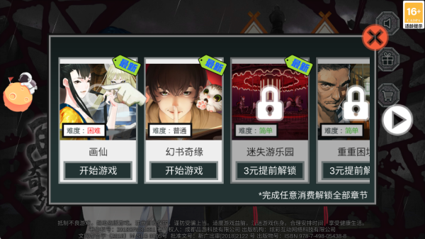 1、含有多个故事剧情引入,每个解谜关卡难度系数不同,选择一个进入剧情挑战谜题。