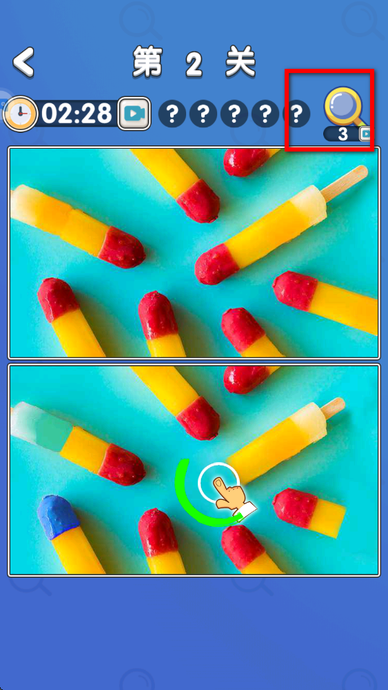 3.每个关卡有着不一样的难点,当你找不到不同的时候使用右上方的放大镜提示道具吧。