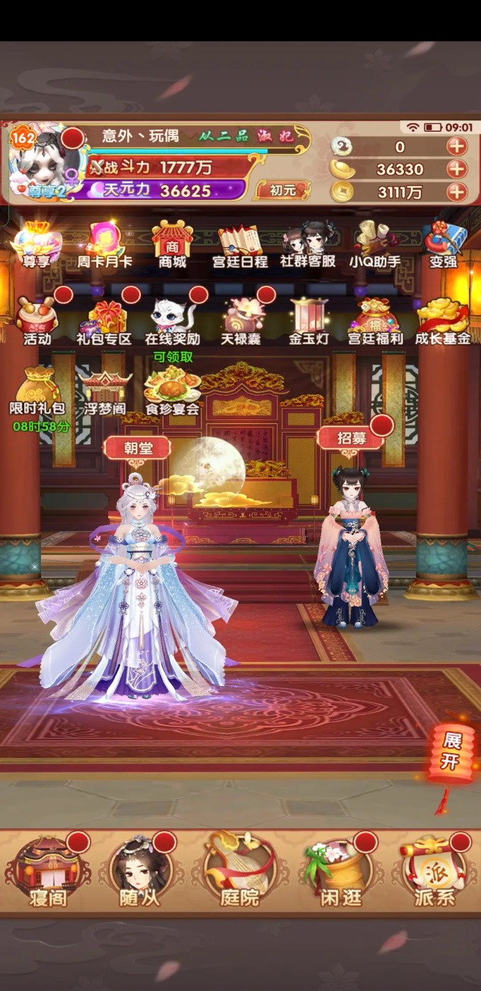 12、达到官品从7后,小主们会正式参与后宫的争斗中,官权,官场,珍宝阁这3个功能,会对玩家开启。