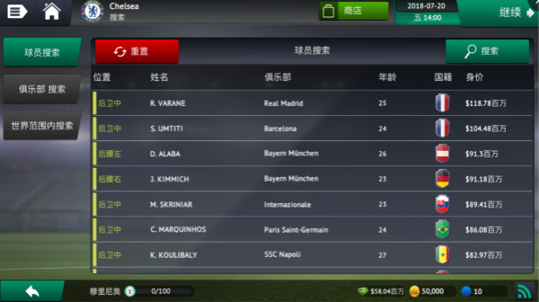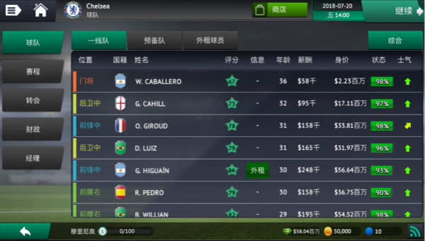 这是《梦幻足球世界》中仅有的初始资金过亿的球队,选择这6支球队中的一支,相当于在起跑线上就已经领先群雄了。算上初始的这一亿多资金,再卖掉队里一些你不喜欢的老将(因为老将随着年龄增大,数值会跌的很快,身价也会狂跌,所以如果有你不喜欢的老将,尽早卖掉,以免贬值),小编是车粉,自然选择执教切尔西,就以切尔西举例: