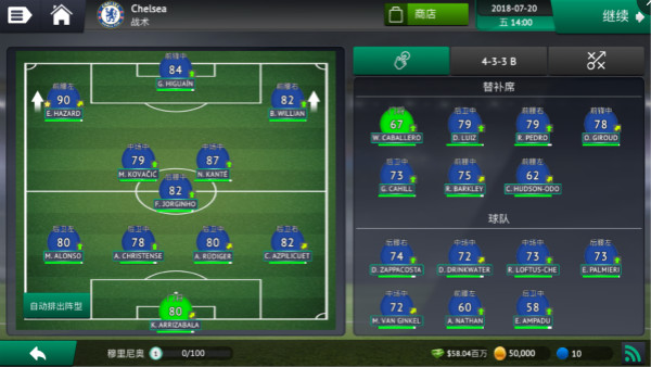 买下这两人之后,手里的钱所剩无几,就这样吧,主打4321,门将科帕(80),左后卫阿隆索(80),中后卫斯通斯(80),鲁迪格(80),右后卫阿兹皮利奎塔(82);三后腰若日尼奥(82),科瓦西奇(79),坎特(87),前场阿扎尔(90),威廉(82),前锋维尔纳(82),主力阵容中,年龄最大的阿兹皮利奎塔28岁,其他人基本都在26岁以下,平均年龄24岁,年龄结构非常好,可以暂时从转会市场里离开,开始新赛季咯。