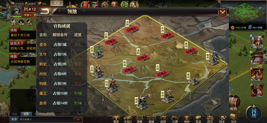 进入领地界面,占领对应城池/州,推进官衔达成进度;
