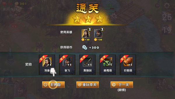 5、最后成功抵御所有波次的敌人进攻即可通关,并获得银币和道具奖励。