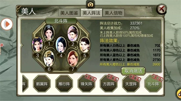 前期阵法没开全时候可以根据职业和需求选择相应的阵法,优先选择上阵美人多的阵法,搭配美人时也应该考虑尽可能多的激活情缘属性。但要注意伤害减免有上限,激活情缘属性时可以优先考虑剩下三条:攻击、防御和生命提高。