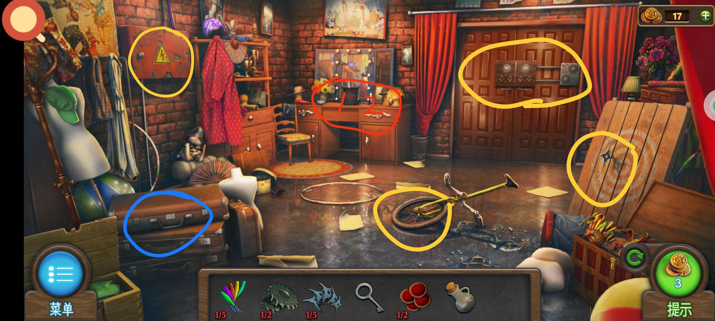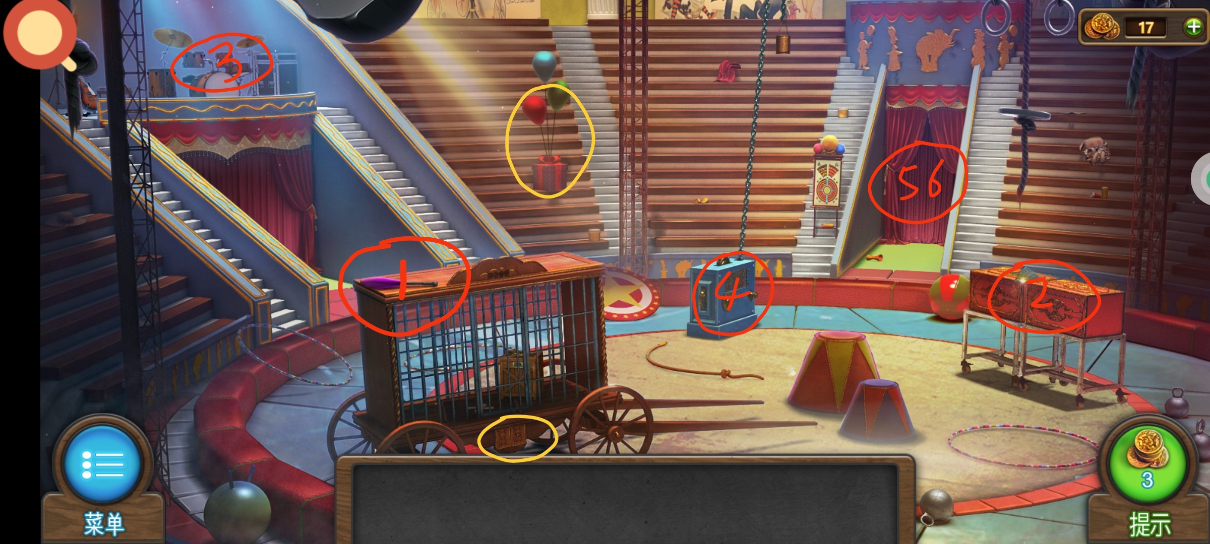 ❶红圈处按顺序点击依次获得道具:①棍子1,②齿轮1,③飞镖1,④钥匙,⑤按钮1,⑥瓶子。