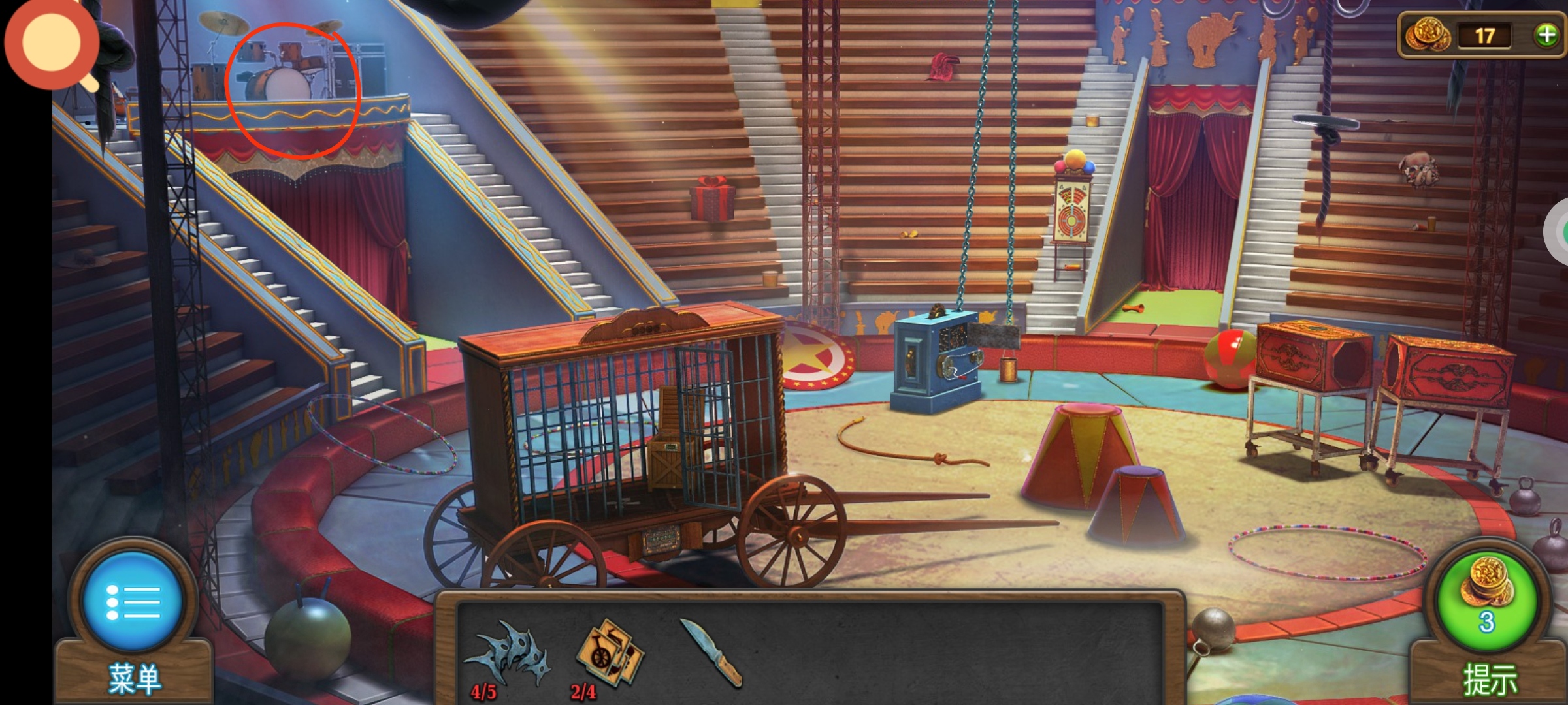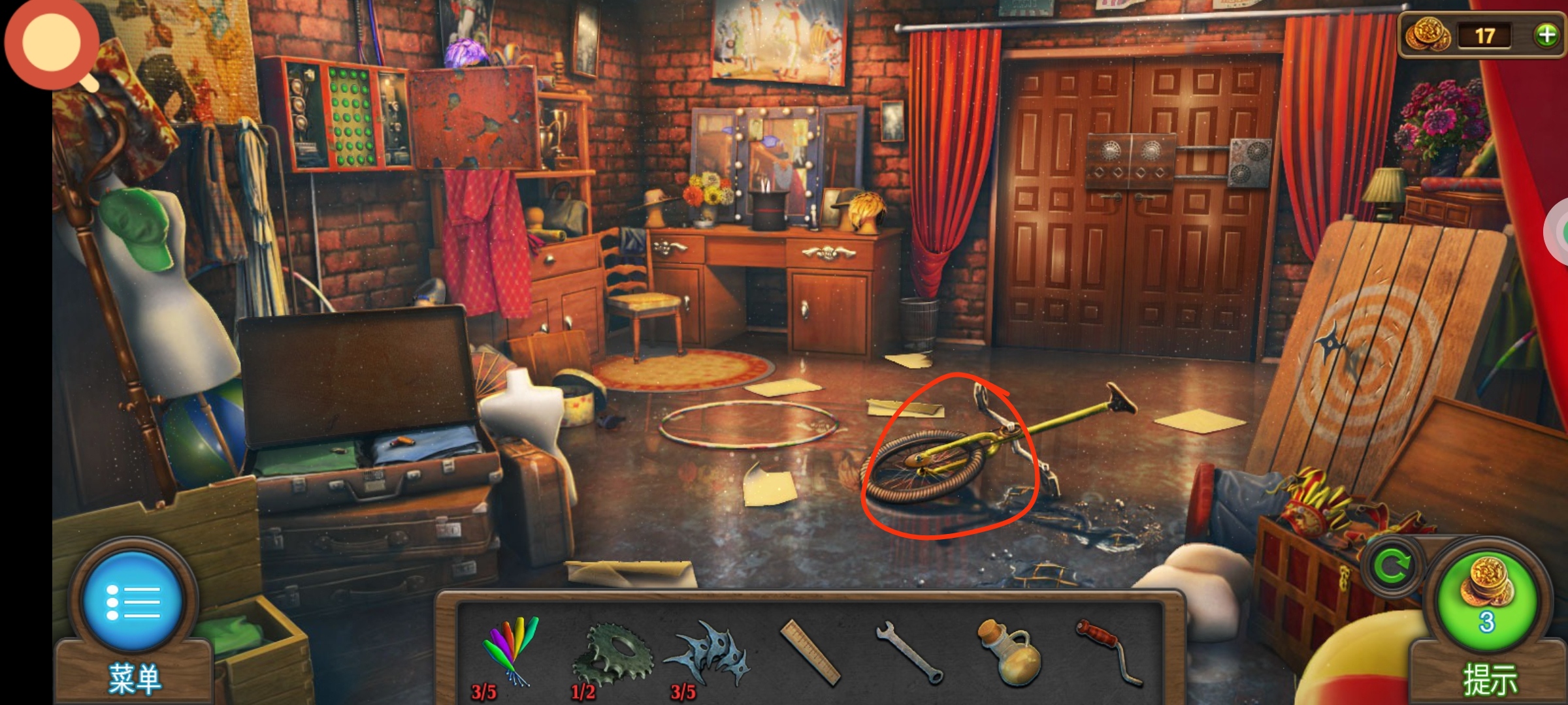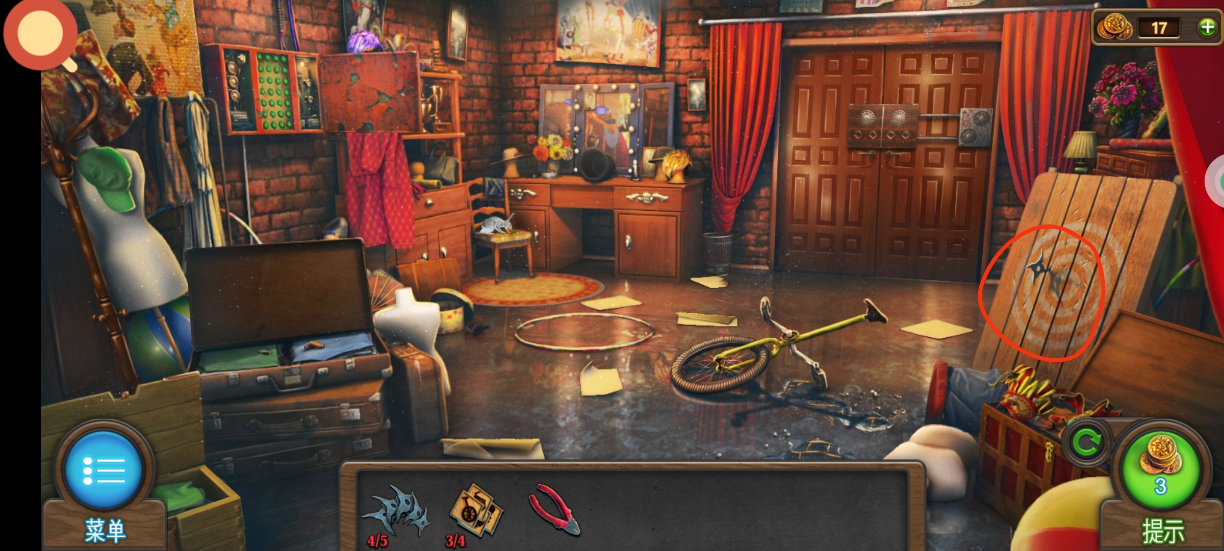 进入主场景,红圈处使用飞镖,将所有的气球都打下来,获得道具:筹码4。