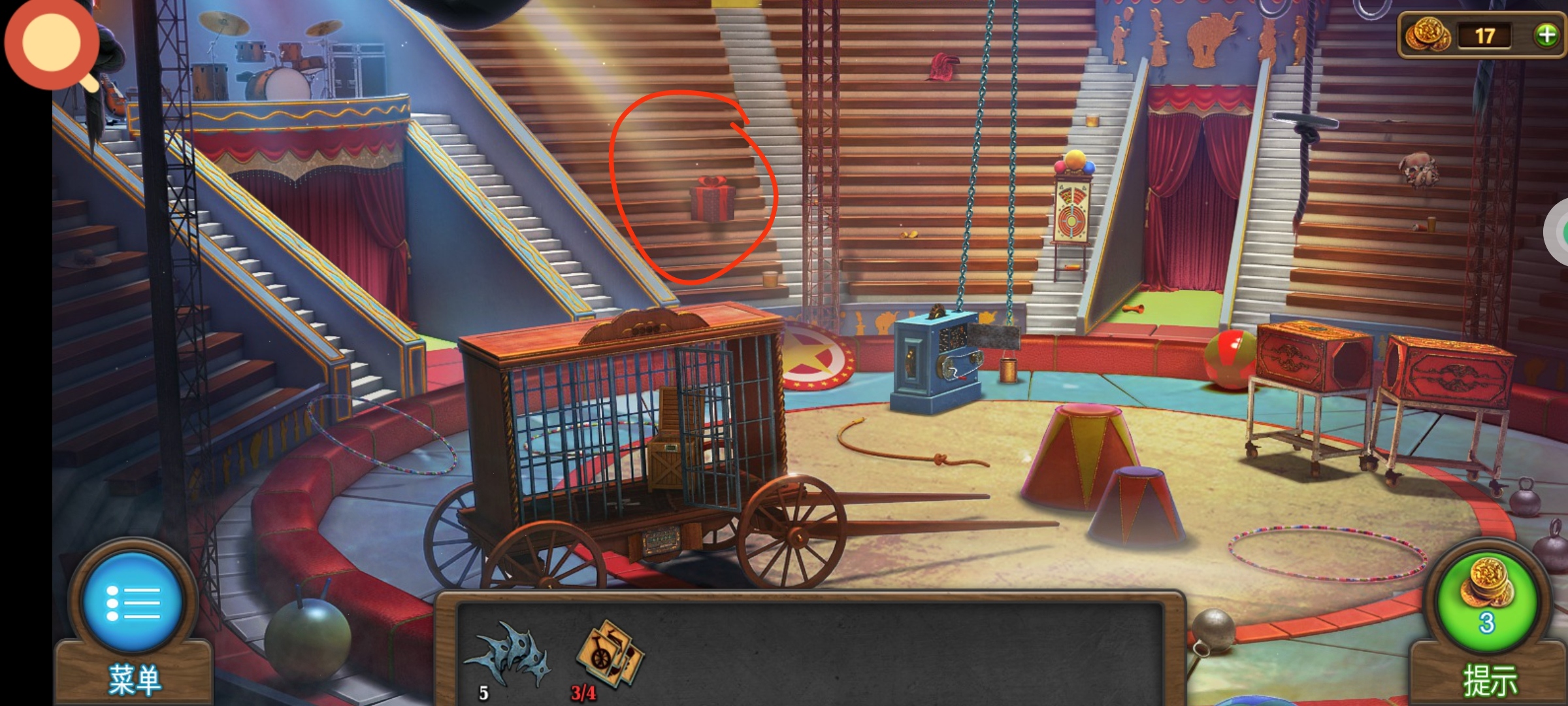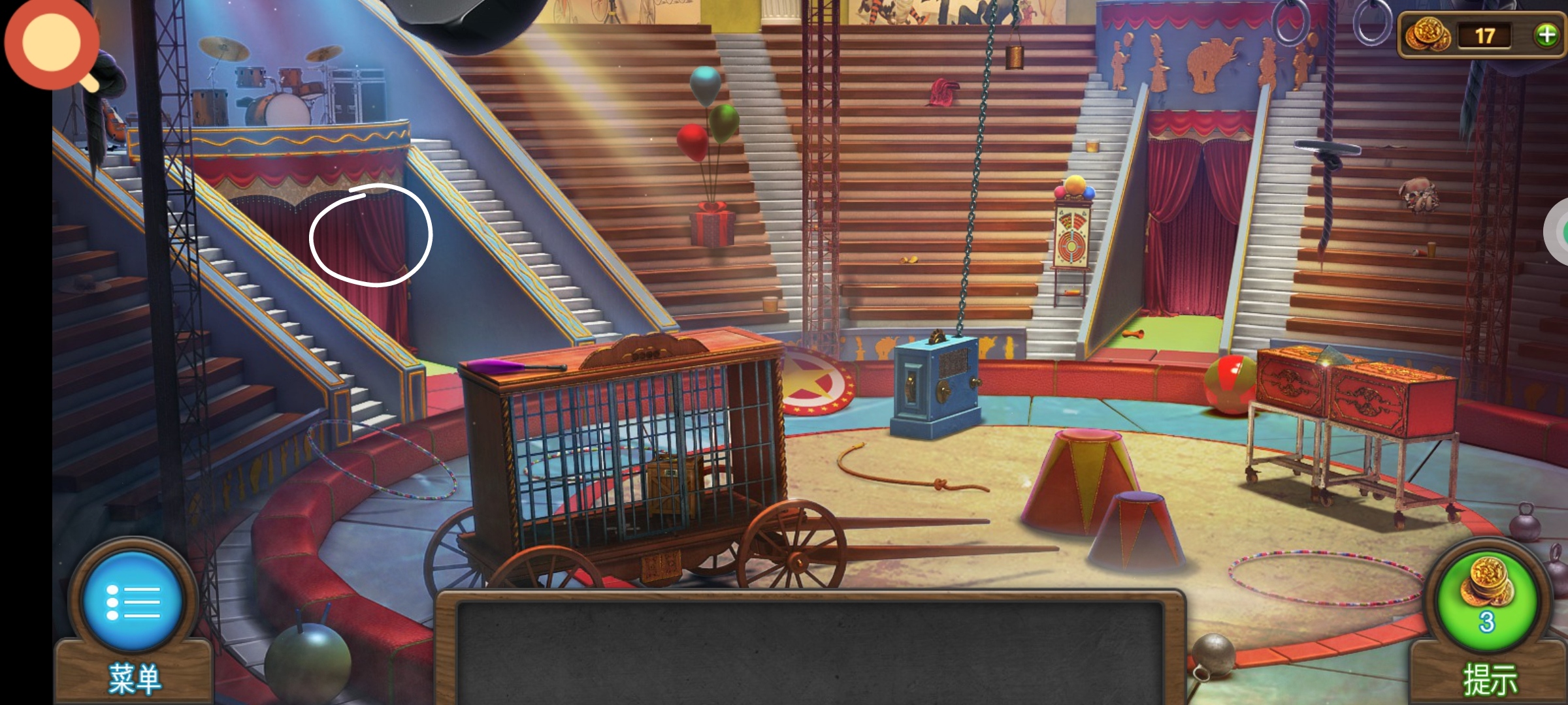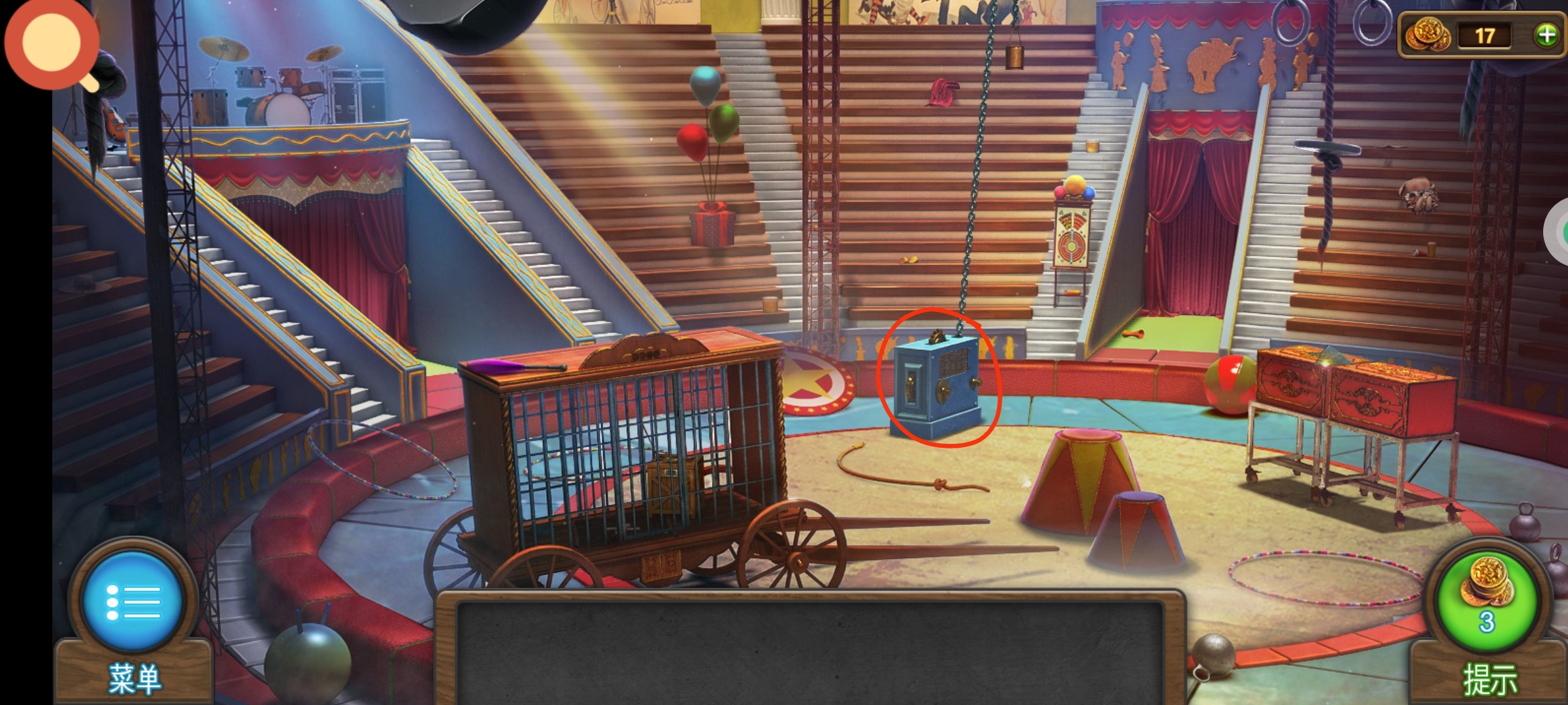 进入主场景,红圈处使用飞镖,将所有的气球都打下来,获得道具:筹码4。