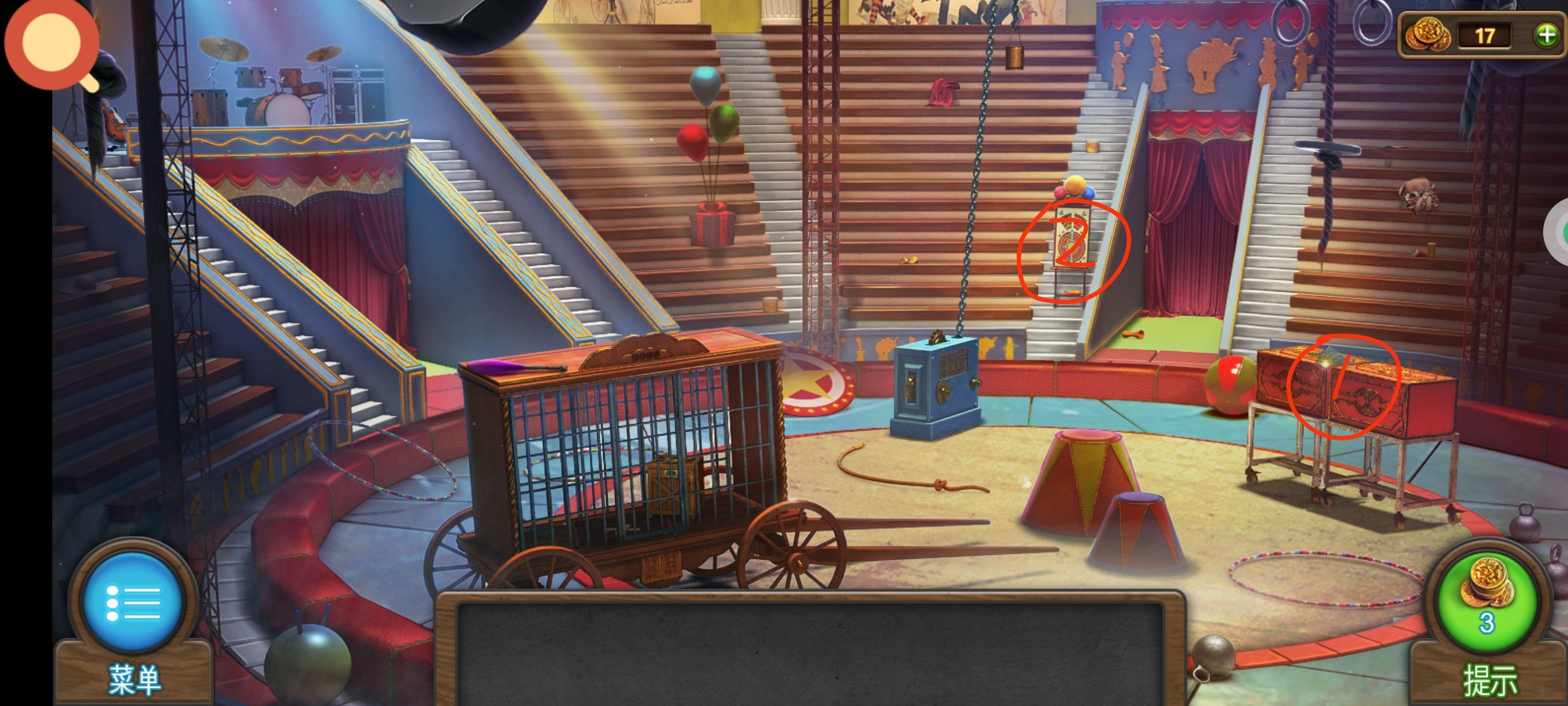 ❶红圈1使用道具把手,将箱子锯开后获得道具:①飞镖2,②按钮2。