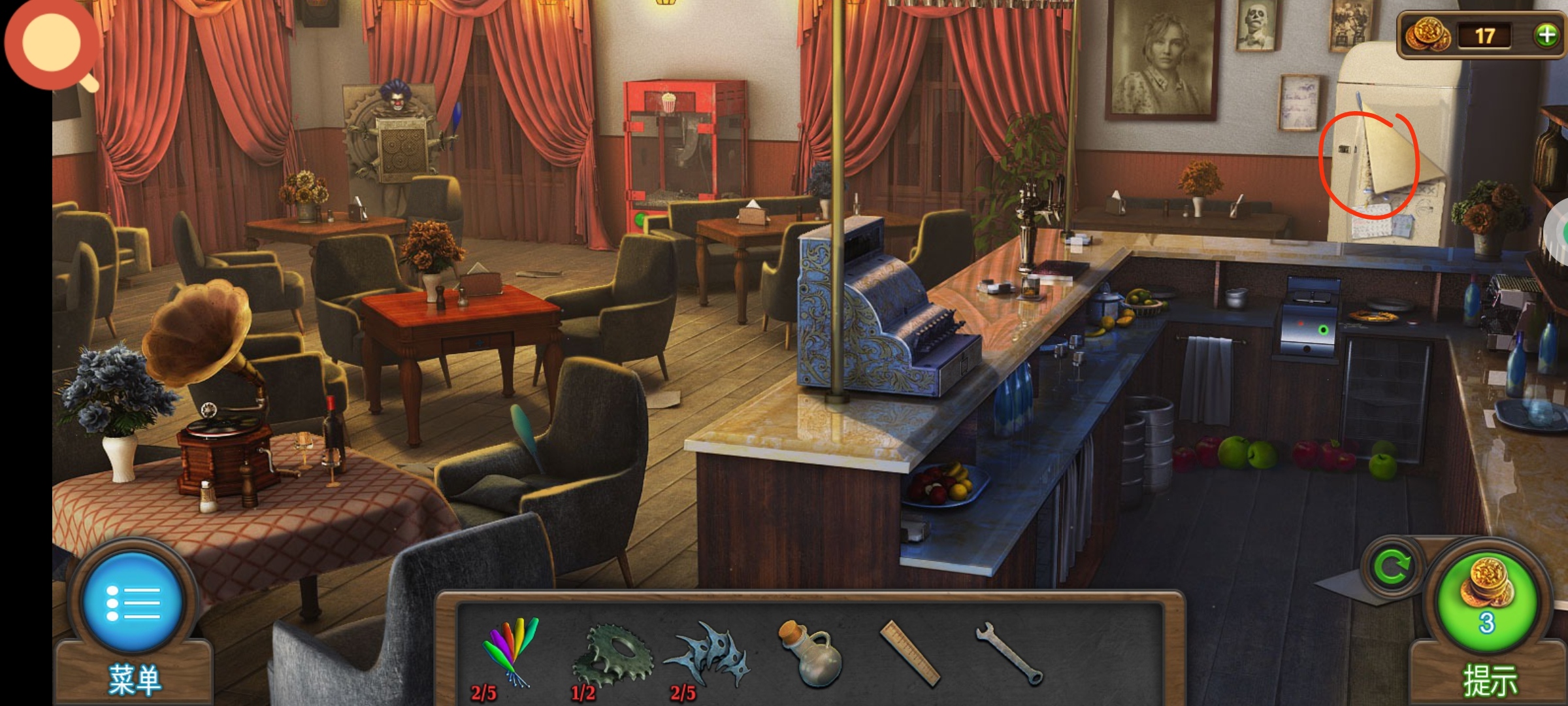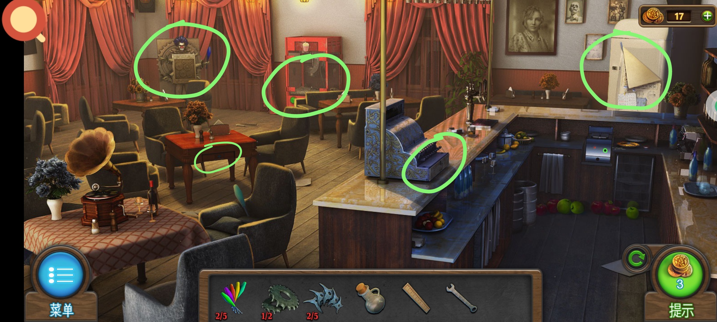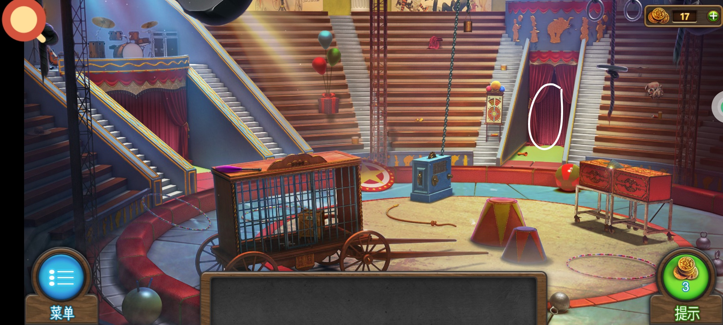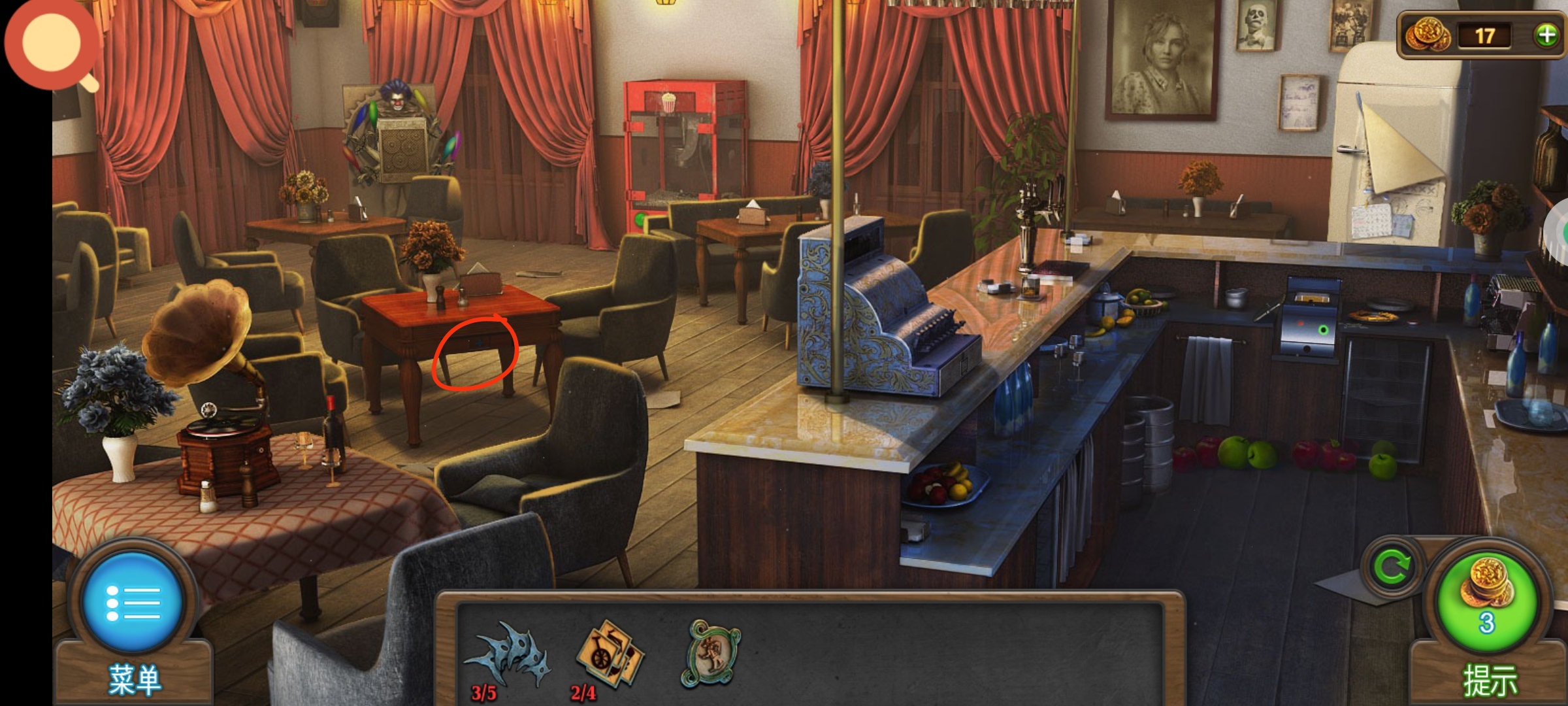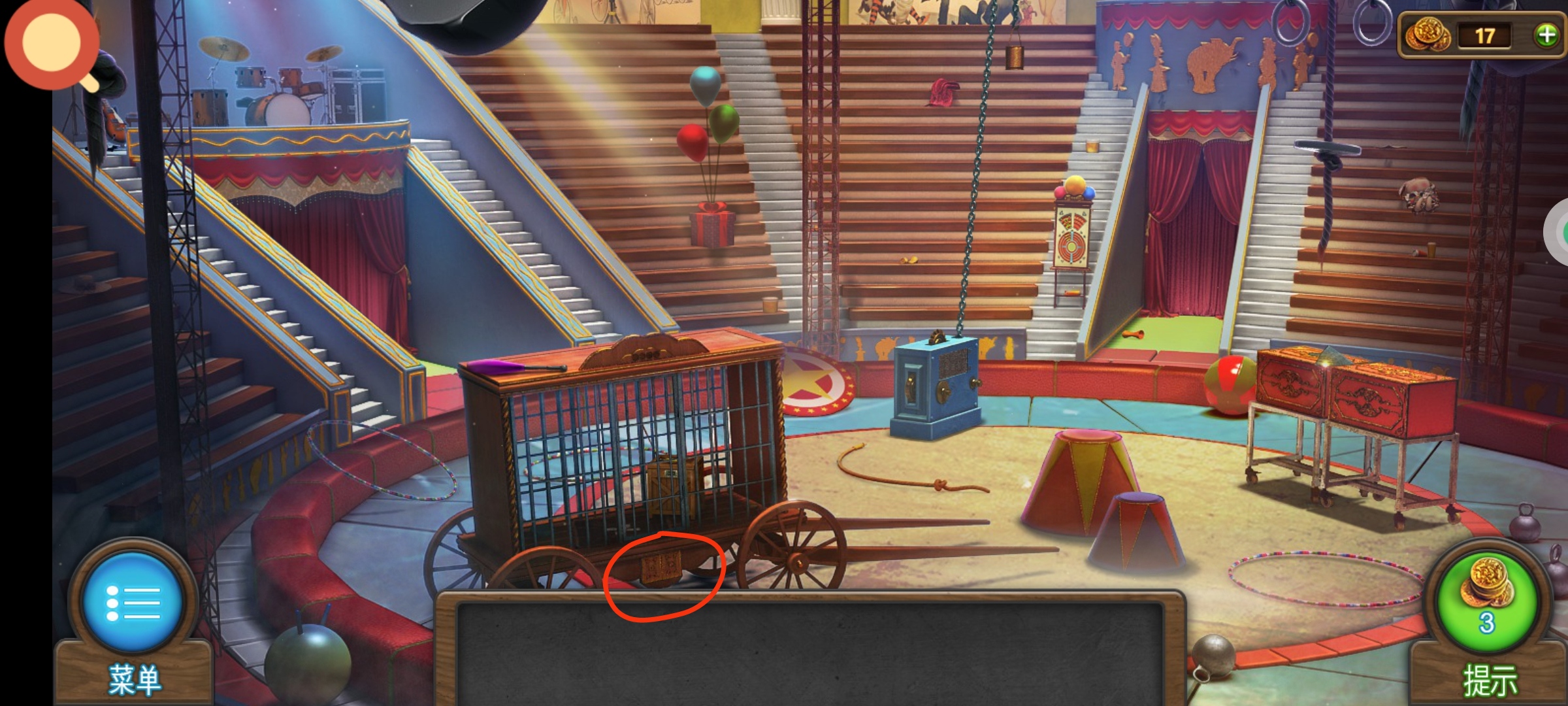 进入主场景,红圈处使用小刀,获得道具:①老虎钳,②筹码3。