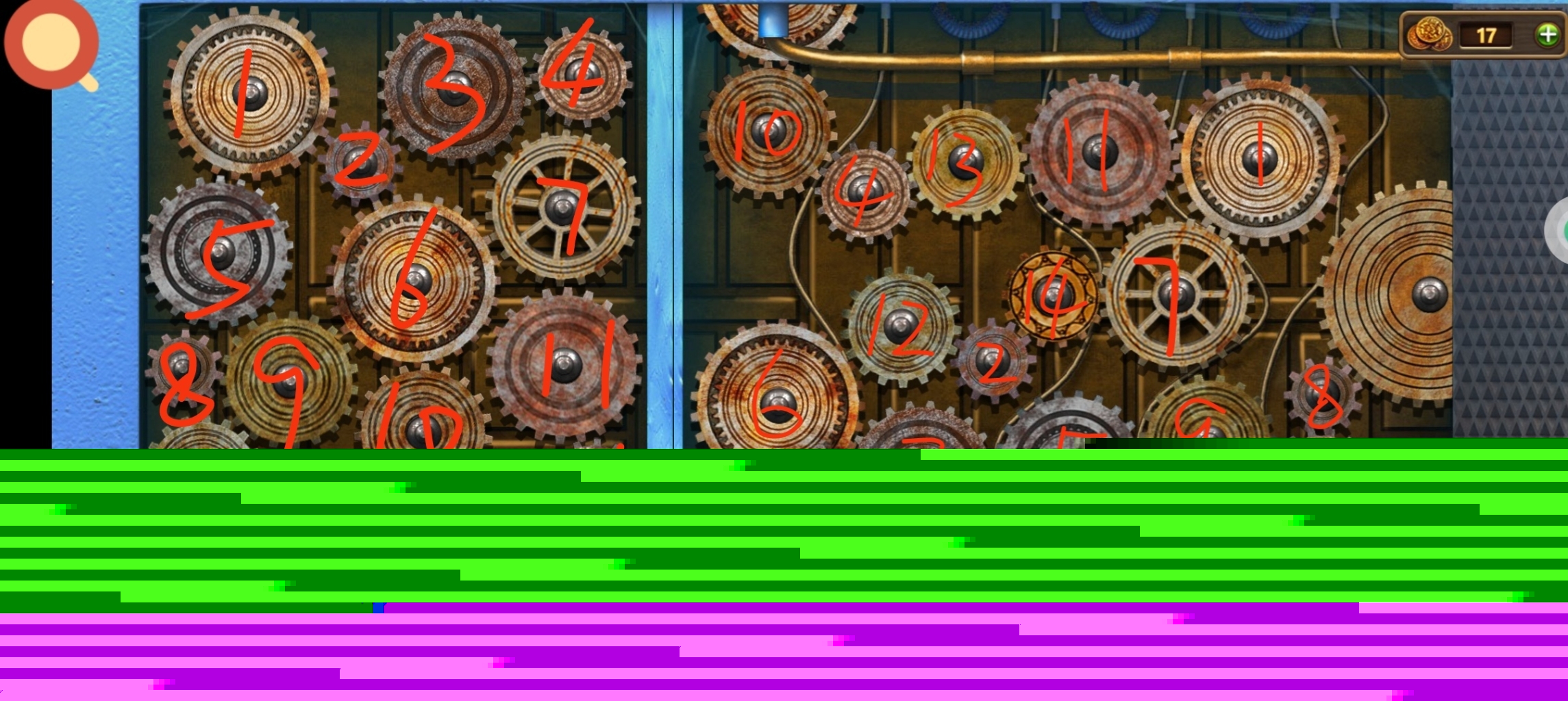 返回道具库,点击红圈使用油和扳手,获得道具:①链条,②齿轮2。
