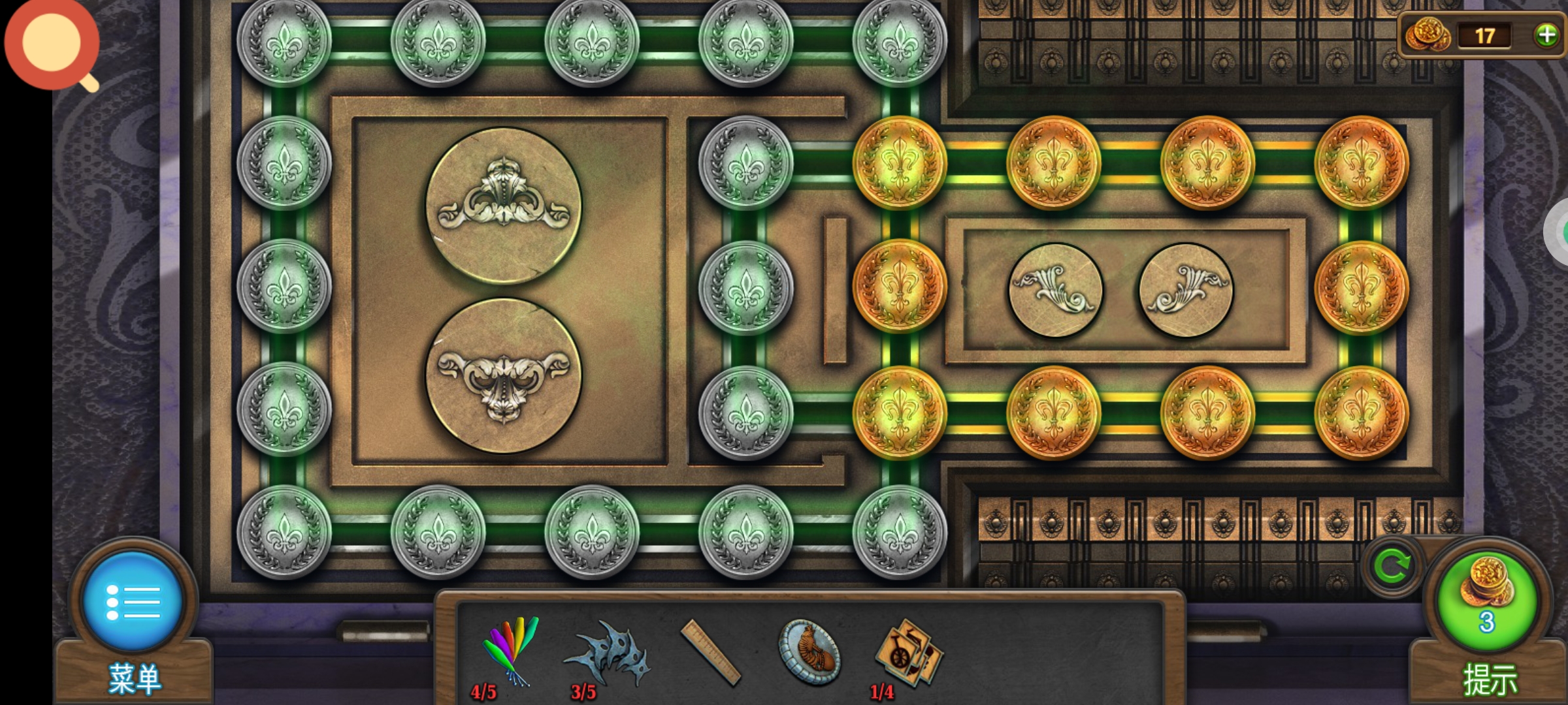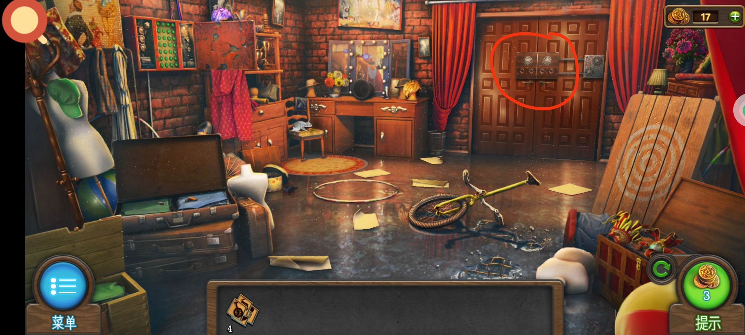 进入道具库,红圈处使用筹码,完成小游戏后通关。