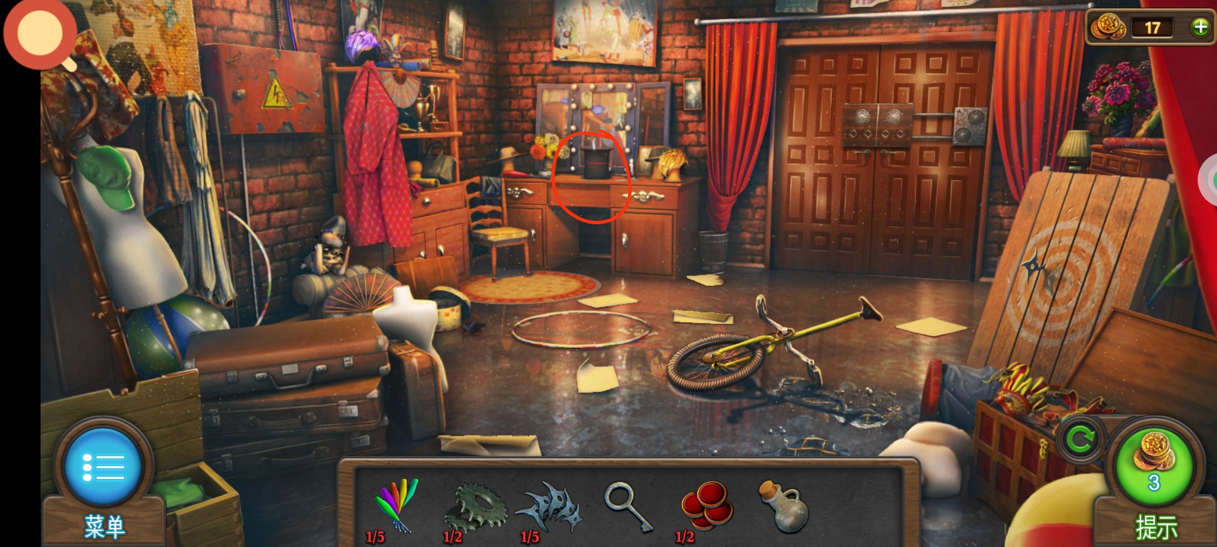 进入道具库,红圈处使用胡萝卜,兔子走后点击帽子,获得道具:①钥匙,②筹码1。