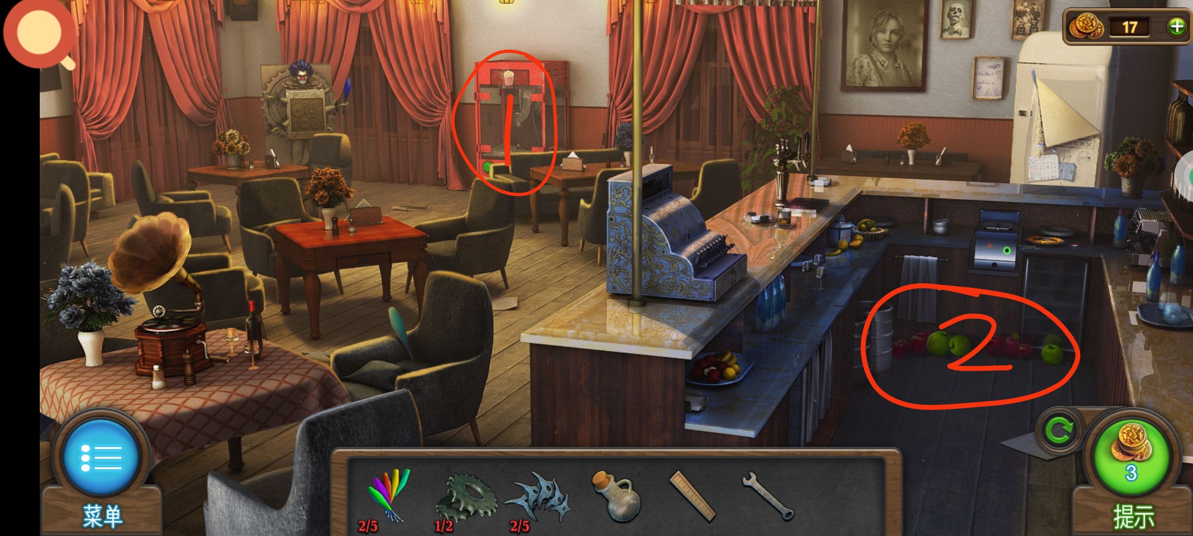 厨房红圈1处使用代币,根据红圈2的苹果提示,顺序为:红红绿绿红红红绿,获得道具:大象代币。