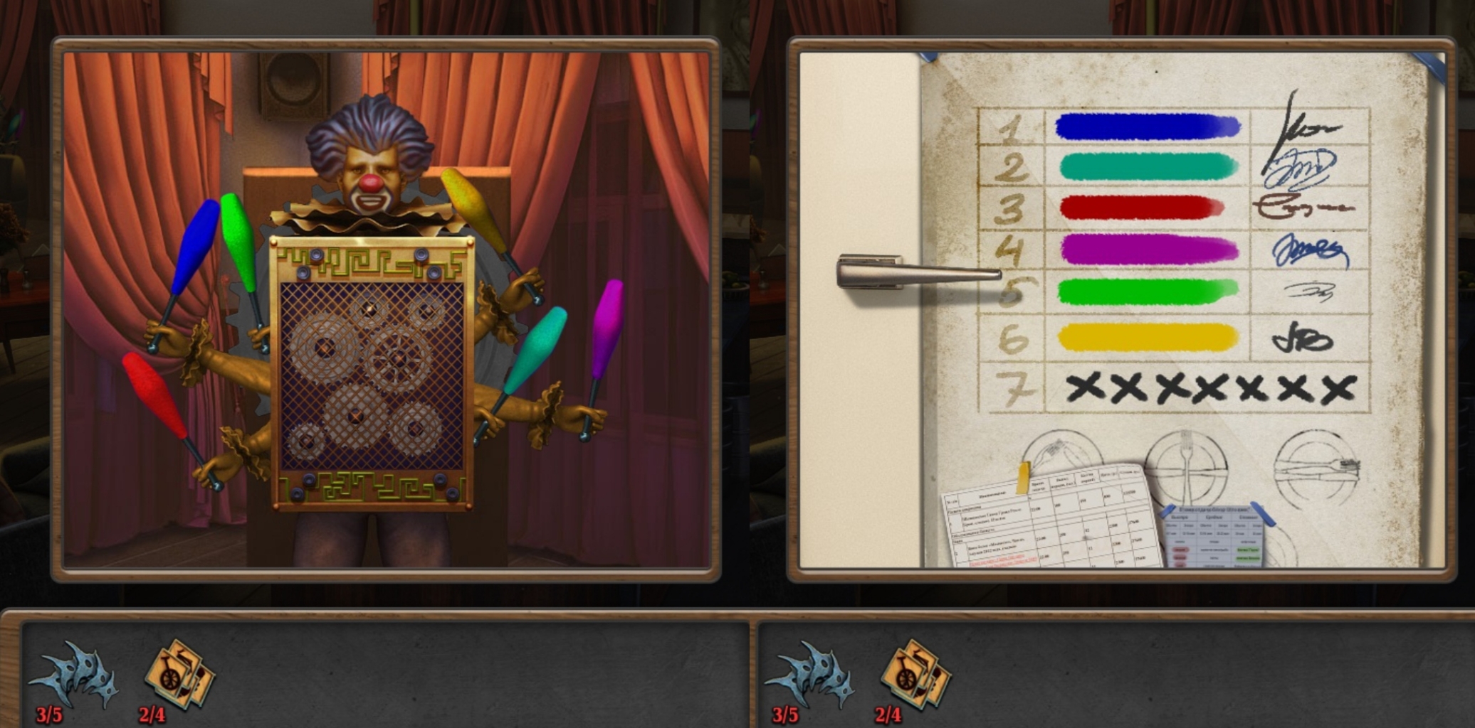 进入厨房,红圈处使用浮雕品,完成小游戏获得道具:①飞镖4,②小刀。