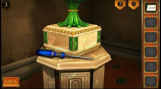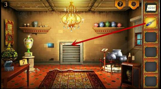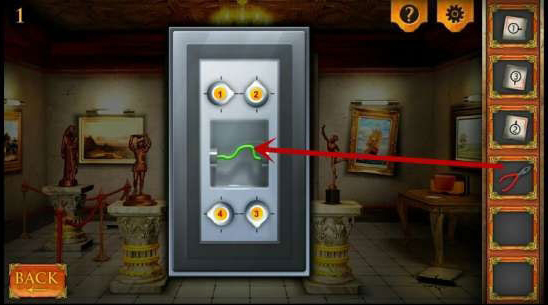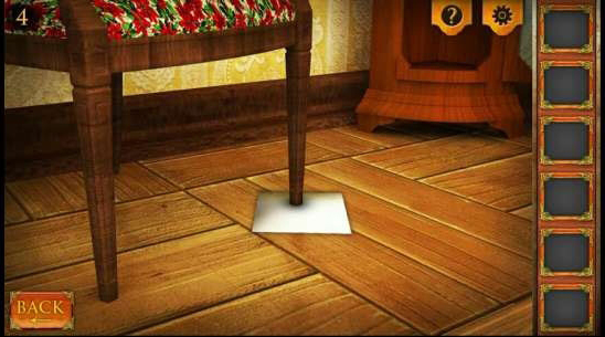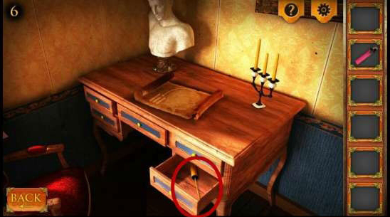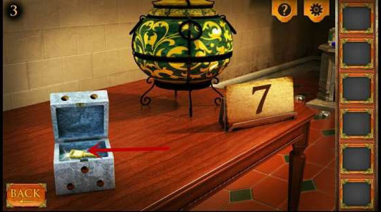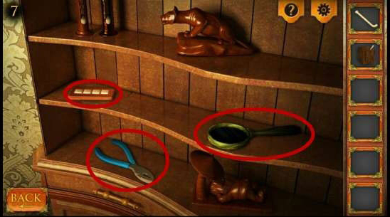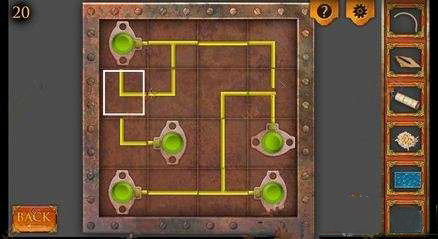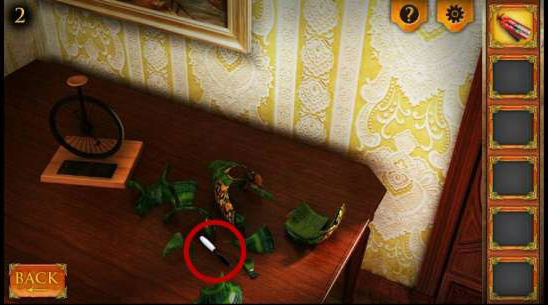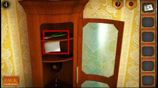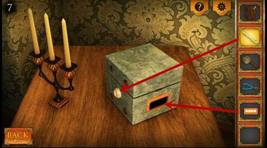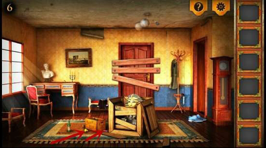 6、点击最左边的箱子,用别针打开锁。打开后根据拿到的两张纸上的提示来调整机关,第一个和第四个都在最上面、第二个在中间、第三个在最下面。