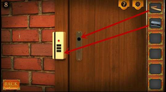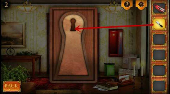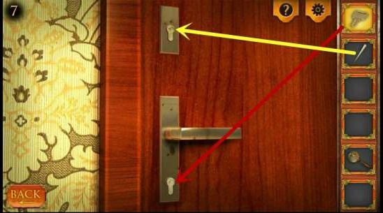 10、来到门,先把钥匙插进下面的锁孔,然后把针插进上面的锁孔。