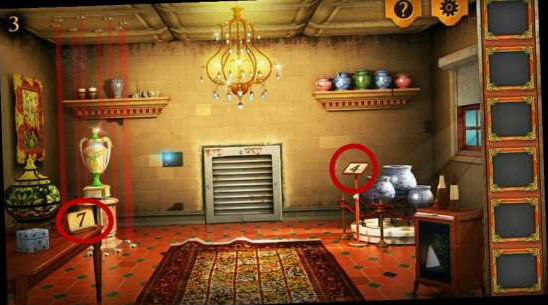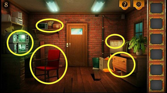 1、注意黄色圈圈所示的5处地方,等会都会用到。首先点击红色椅子获取,然后把椅子放到门左侧的位置。