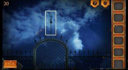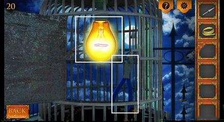 4、点击画面左侧的鸟笼查看详细,点击一根铁棍会发出淡黄色的光,再点击空的凹槽会放入相应的位置,只要将下图中小编标出的最后一根放到相应位置就可以解开了。