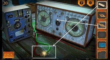 22、回到仪器桌面,将绿色和红色的线移动会冒出火花,将纸筒、火药、引线结合起来得到烟雾弹,用火花点燃。将在望远镜处得到的图纸放入仪器内。