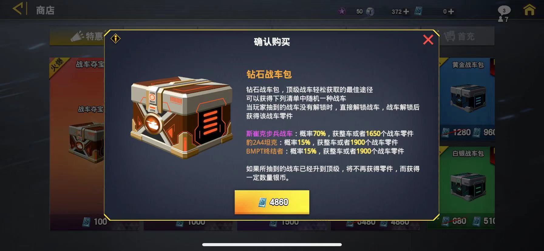 不过最受大家吹捧的还当属钻石战车礼包,里面包含的可都是顶级战车,其中斯崔克步行战车的获取概率为70%,豹2A4坦克以及BMPT终结者的获取概率各为15%,售价自然也是最贵的,高达6480点券。