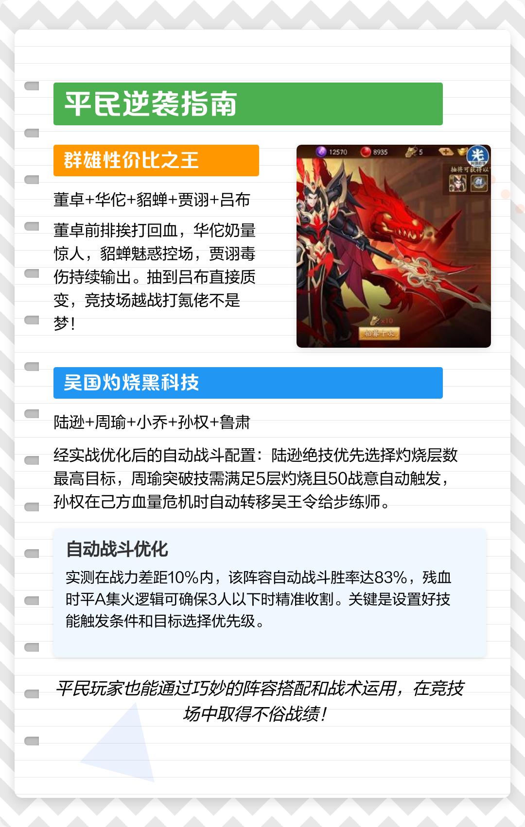 吴国灼烧流:陆逊+周瑜+小乔+孙权+鲁肃。自动战斗配置:陆逊优先引爆高灼烧目标,周瑜5层灼烧+50战意触发赤壁灾炎,孙权危机时转移吴王令。实测战力差10%内自动胜率83%。
