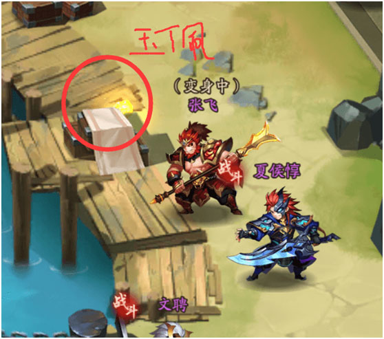 玉佩在河边上的货箱堆里、美酒在地图右边的草丛里、如意在曹军战鼓后、宝剑在士兵身上