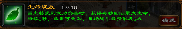 生命绽放,回复型技能,满级后在主将收到武力伤害时获得每秒5%最大生命值的回复,持续5秒。每场战斗能出发两次。
