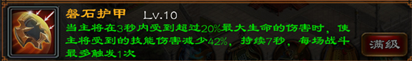 磐石护甲,防守型技能,满级后效果为当主将在3秒内收到超过20%时,使主将受到的技能伤害减少42%,持续7秒。